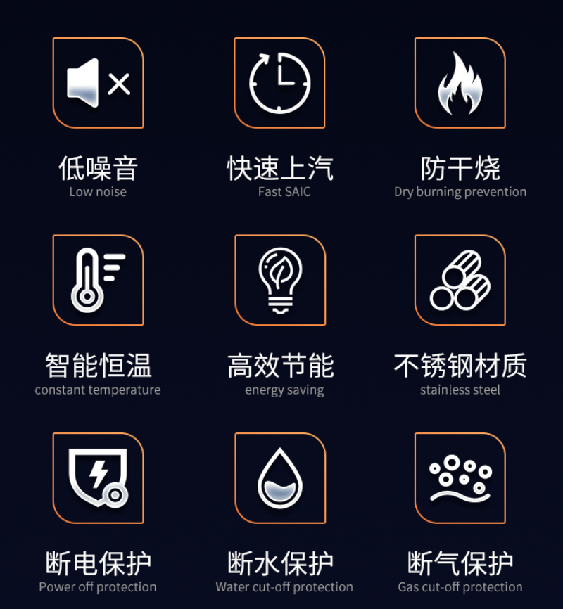 2:智能控制,性能穩(wěn)定,控制系統(tǒng)配有獨(dú)立電箱,電子脈沖點(diǎn)火,五針一體式獨(dú)立高壓點(diǎn)火器,風(fēng)機(jī)自帶故障檢測(cè)功能,控制器全密封,杜絕鼠蟲(chóng)困擾,防潮防水耐高溫,冷水90秒超快出蒸汽,熱水5秒出蒸汽。