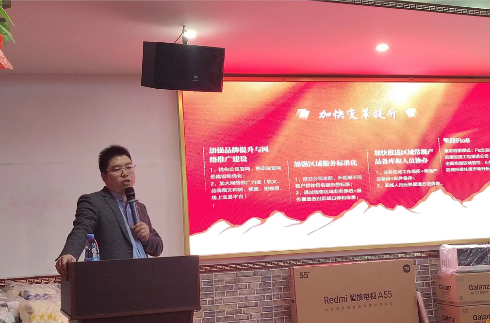 隨后,銷售部總監(jiān)巨川平發(fā)表了演講。對(duì)去年公司的整體銷售數(shù)據(jù)進(jìn)行匯報(bào),在過去一年里新增客戶單位1600家,新增300%老客戶業(yè)績(jī),組織籌辦了3次展會(huì)。并統(tǒng)一了市場(chǎng)開發(fā)策略,他強(qiáng)調(diào)了銷售工作的重要性和挑戰(zhàn)性,并表示將在新的一年里繼續(xù)挑戰(zhàn)更高的業(yè)績(jī)目標(biāo),加強(qiáng)團(tuán)隊(duì)建設(shè),提高員工素質(zhì)和專業(yè)技能,以更好地服務(wù)客戶,提升公司品牌形象和市場(chǎng)競(jìng)爭(zhēng)力。